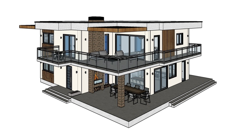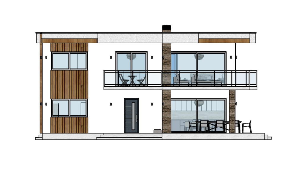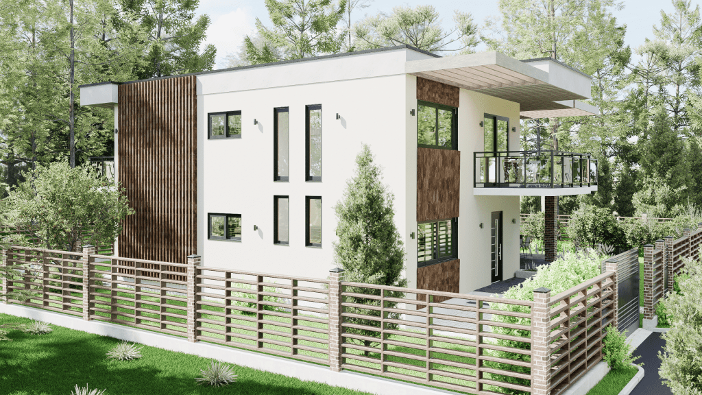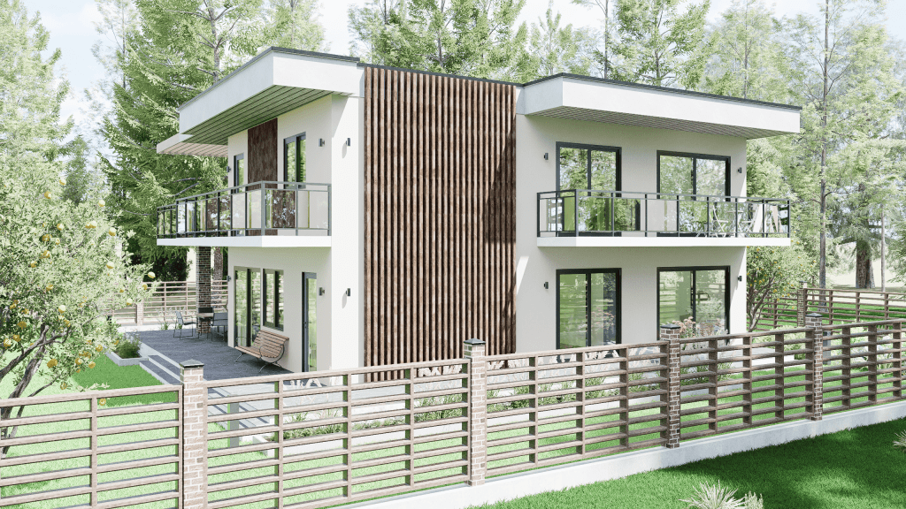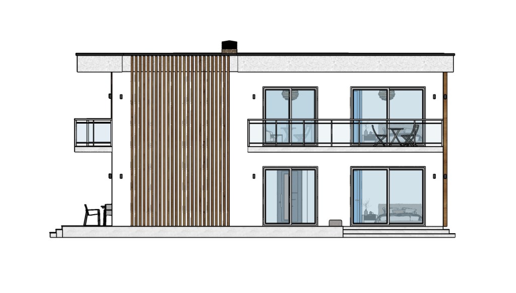 The facade is finished with plaster, complemented by inserts of thermally treated wooden panels and vertical slats.
