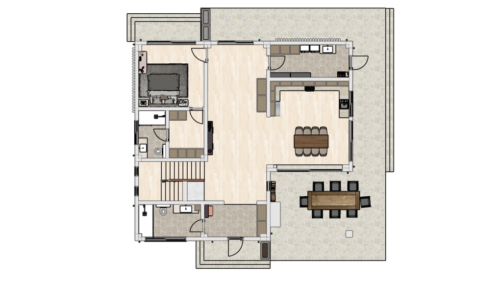 The ground floor layout includes a kitchen–living area with access to an open terrace, one guest bathroom, one guest bedroom with access to the inner courtyard, featuring its own walk-in closet and bathroom, and one technical/utility room with direct access to the garden.
