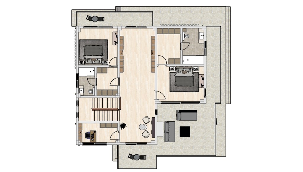 The second floor accommodates two bedrooms, each with a walk-in closet and a private bathroom. The master bedroom includes access to a 54 m² terrace.