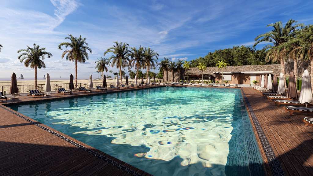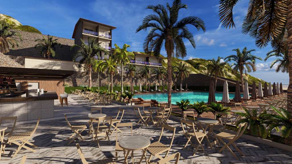 The facade of the hotel is clad in travertine and the balconies are separated by vertical wooden slats. The rooms feature panoramic glazing. The color palette includes beige, gray and brown tones.
