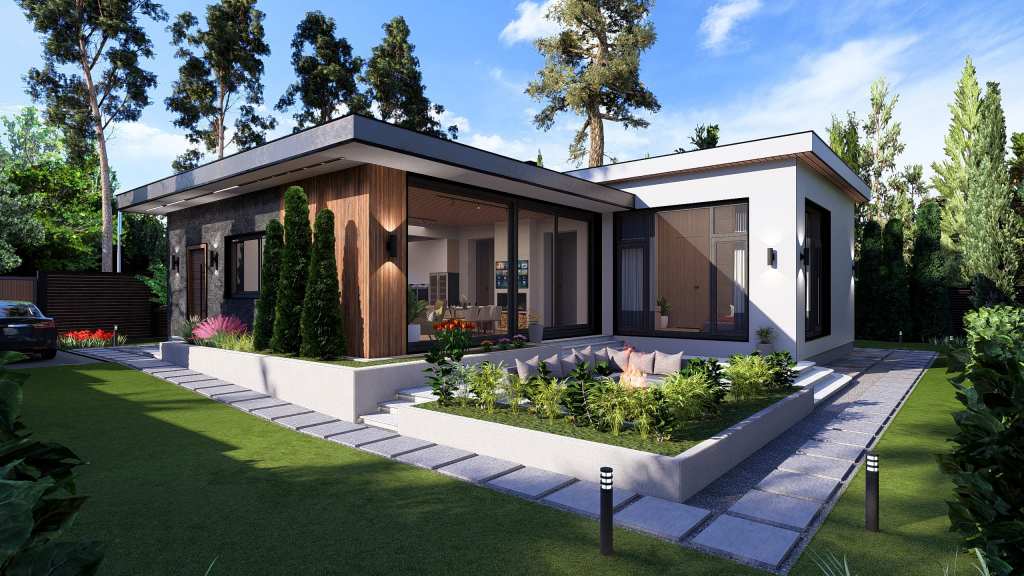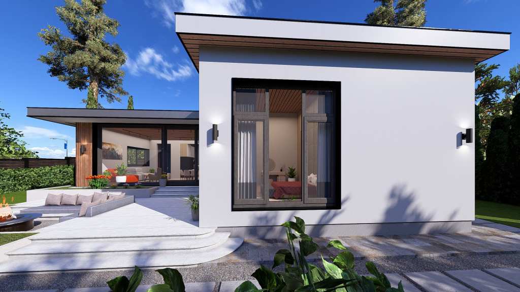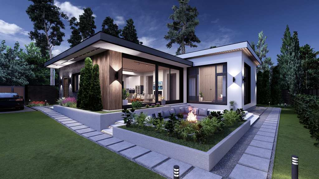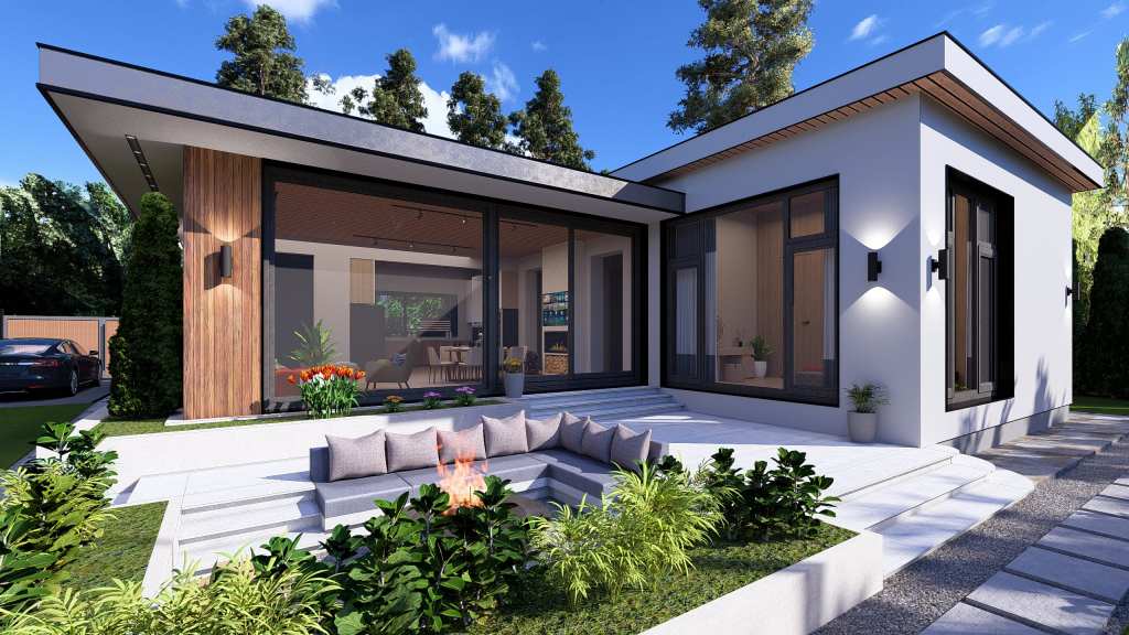 The main feature of this house is its panoramic windows overlooking an open patio with a fire pit and garden. The interior walls are finished with decorative plaster.