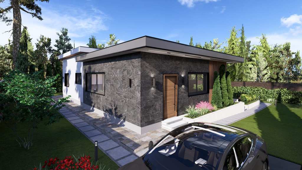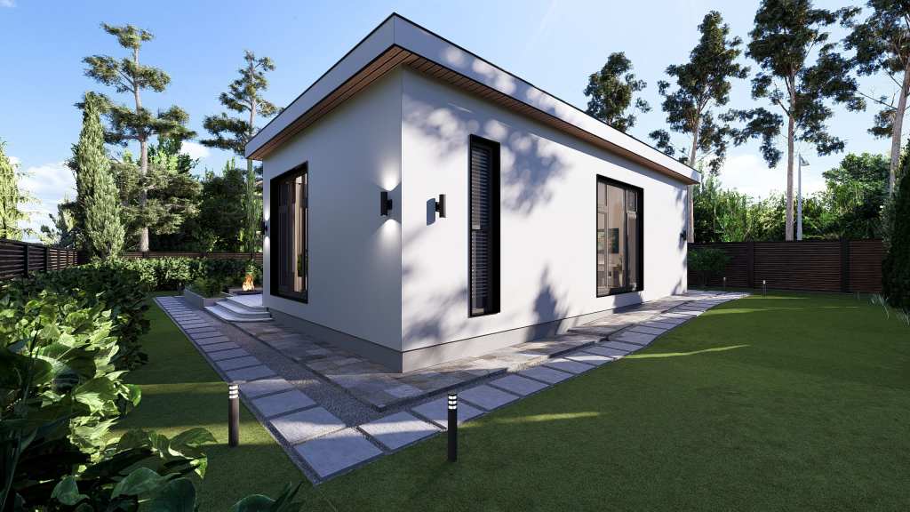 Hidden doors with a height of 2.4 meters are veneered with natural wood. The house consists of two sections separated by roofs of different levels. The first section, with a ceiling height of 3.5 meters, accommodates the kitchen and living area. The second section, with ceilings of 4.2 meters, contains two bedrooms, each with its own walk-in closet and bathroom.