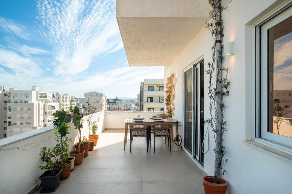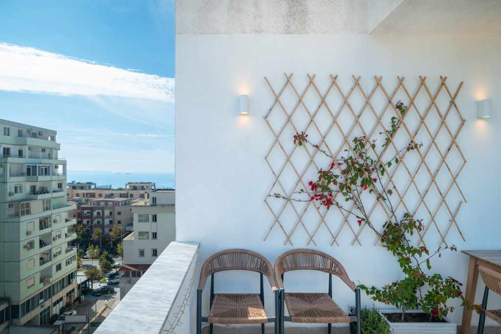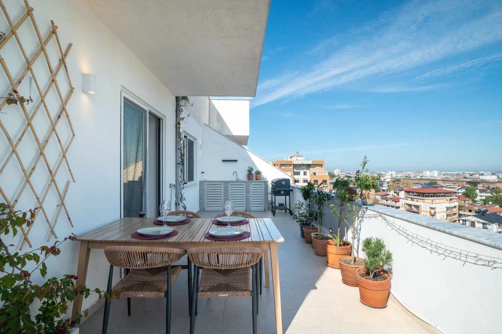 Penthouse (papafingo) in Durrës, Albania, located on the 9th floor with views of the city, the mountains, and a partial sea view.