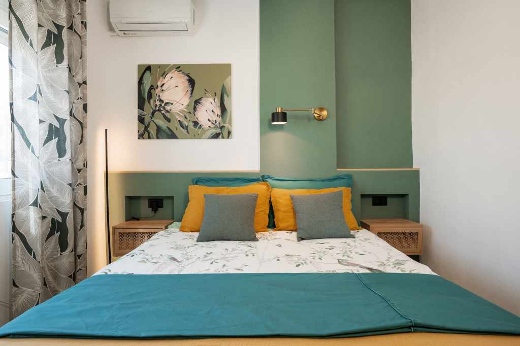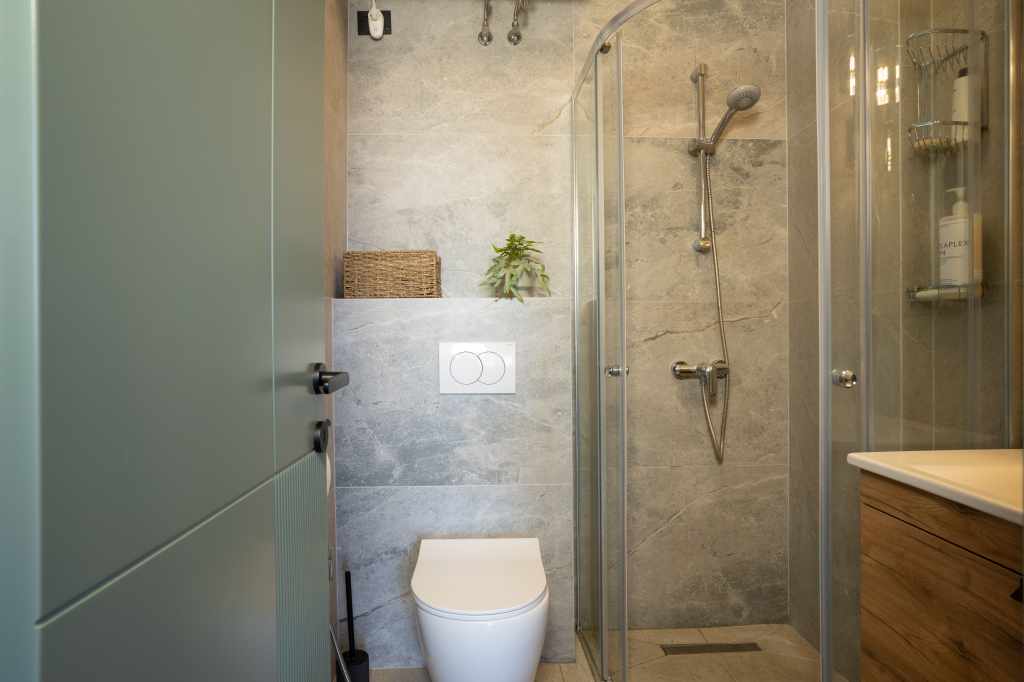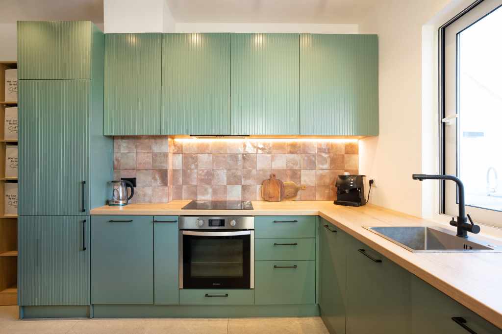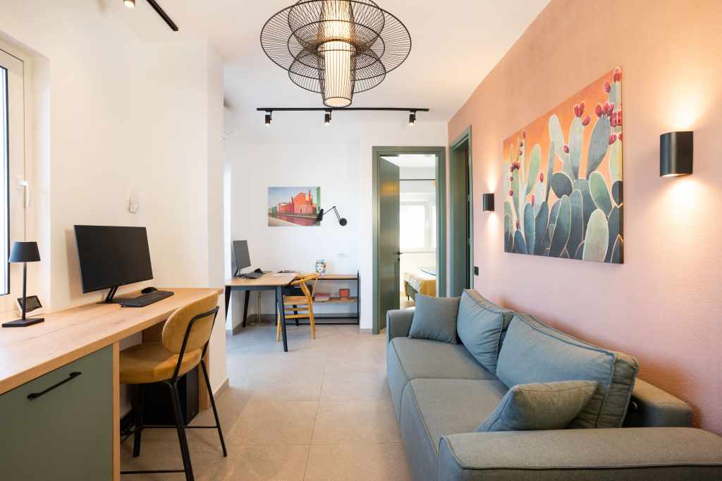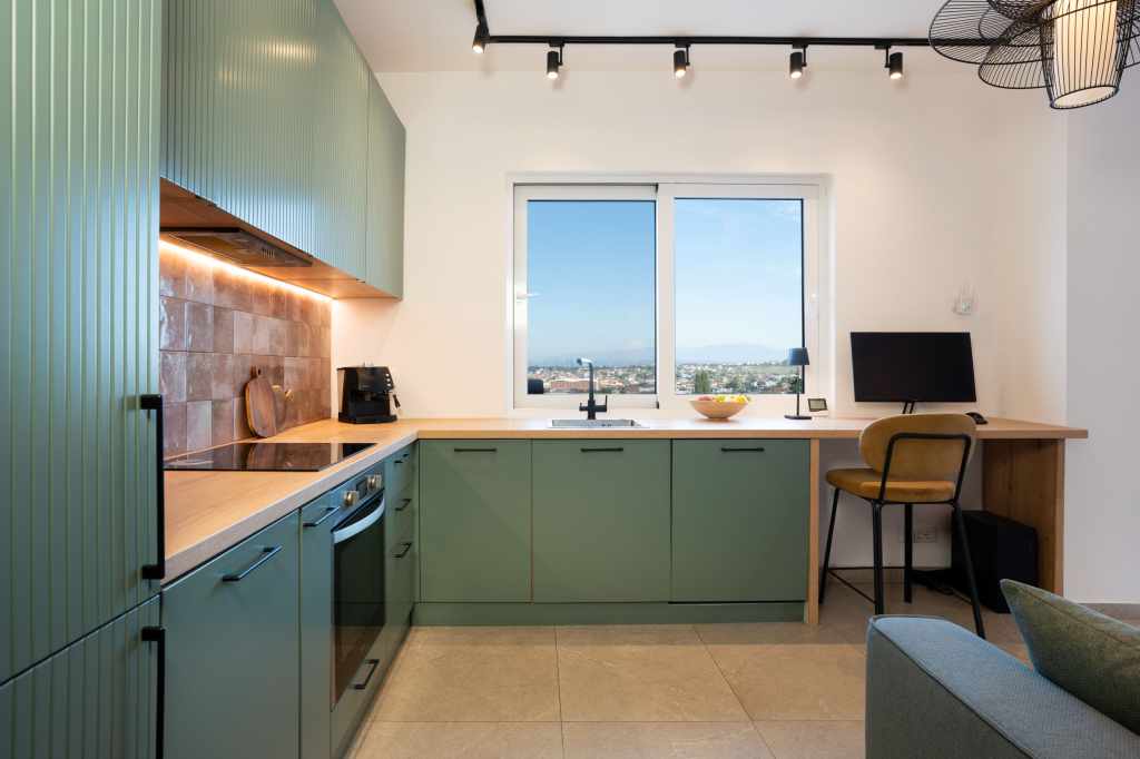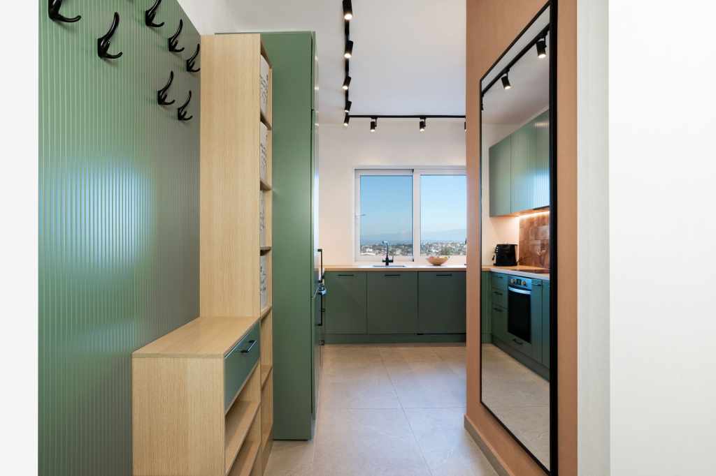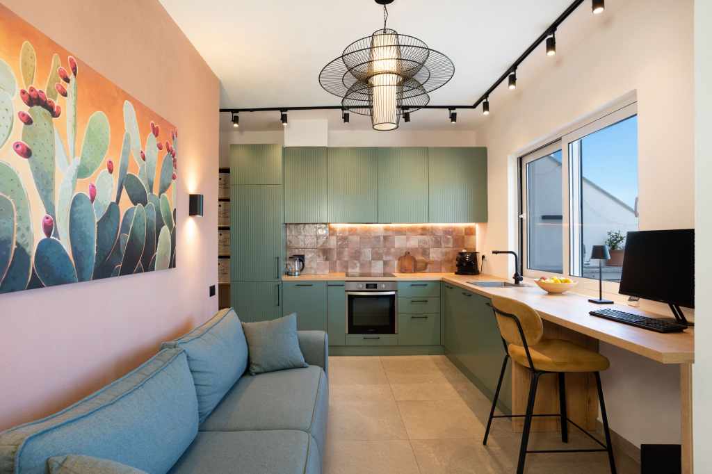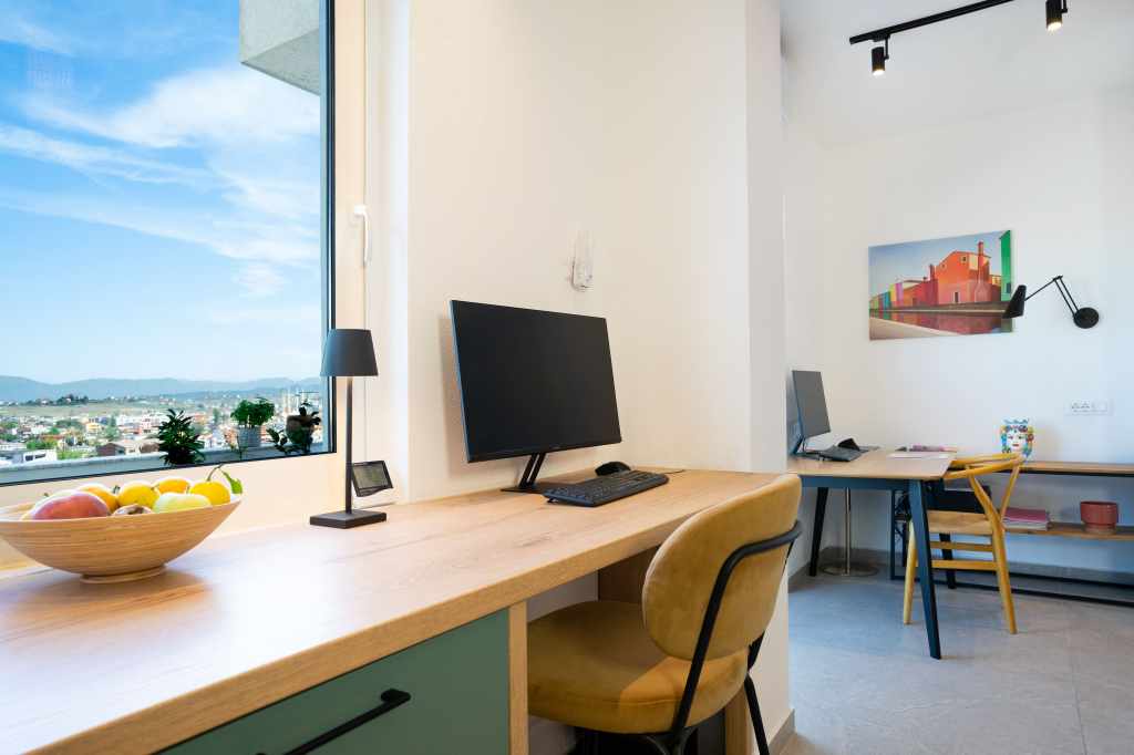 The layout was completely redesigned, as the space was rather limited. As a result, an L-shaped functional kitchen was created, with a sink positioned by the window overlooking the city. Two separate workspaces were arranged, one of which is suitable for full-time remote work.