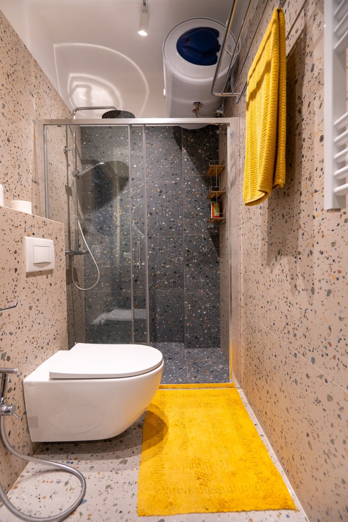 The bathroom was completely redesigned in brighter tones. The original gypsum molding on the ceiling and walls, provided by the developer, was preserved.