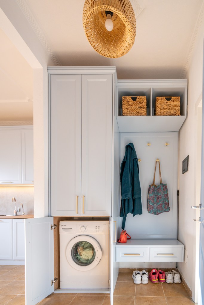 The concept focuses on bright colors, as the apartment is located on the sunny side. A minor layout modification was made to improve the overall functionality of the spaces. As a result, a large and spacious wardrobe was added in the bedroom, the living room area was expanded to accommodate a large dining table and a dedicated workspace.